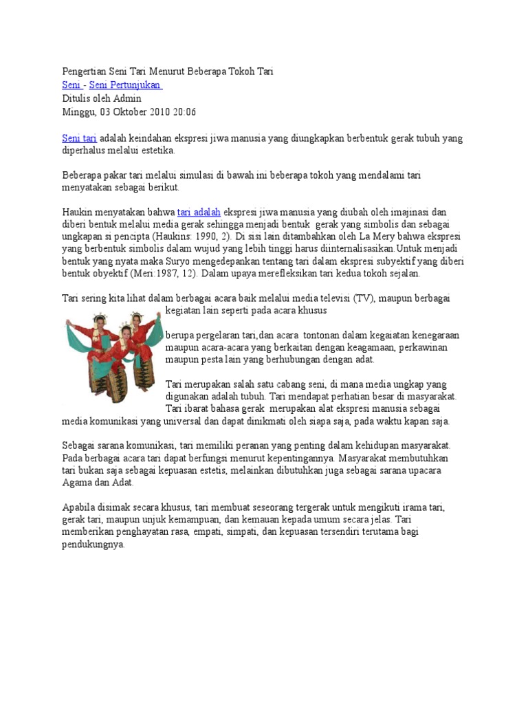Related : Seni Tari Adalah Salah Satu Cabang Seni Yang Dalam Aplikasinya Menggunakan Media - Haukin menyatakan bahwa tari adalah ekspresi jiwa manusia yang diubah oleh imajinasi dan diberi bentuk melalui media gerak sehingga menjadi..