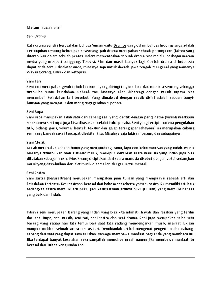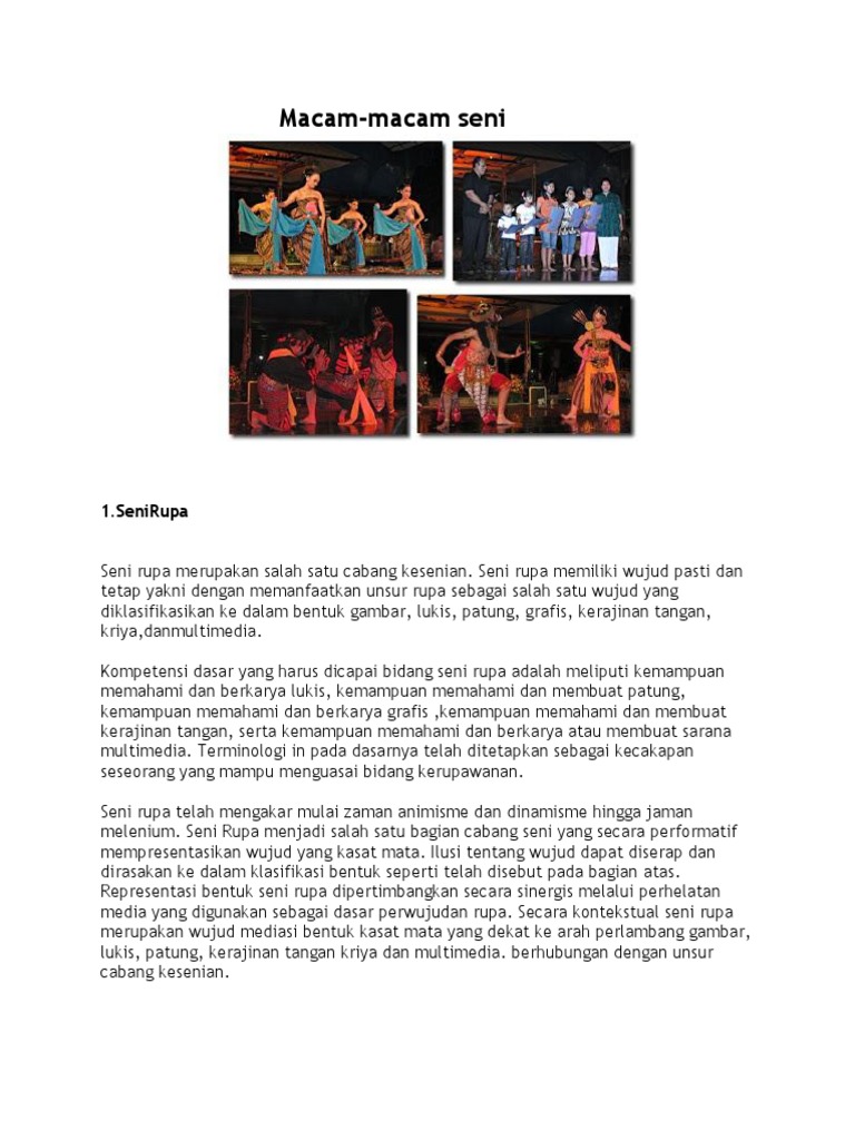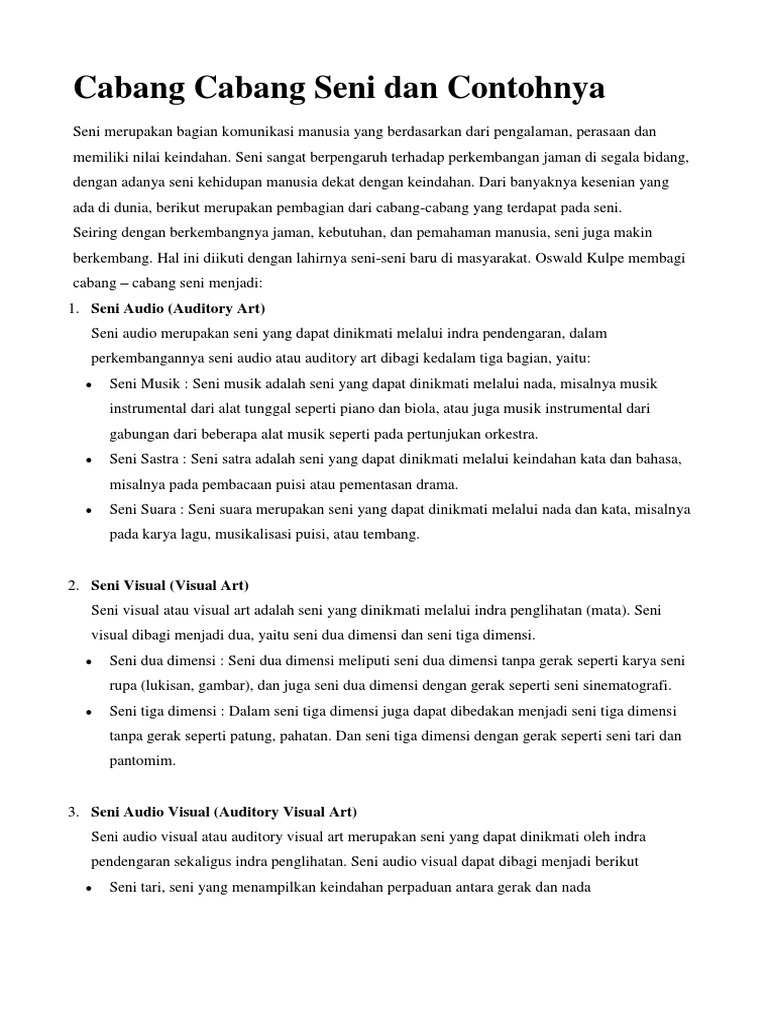 Seni rupa merupakan seni dua dimensi atau tiga dimensi, yang bisa dinikmati dengan menggunakan indera penikmatnya pendengaran dan peraba. Seni musik adalah salah satu cabang seni yang menggunakan media bunyi sebagai sarana pengungkapan ekspresi senimannya. Seni tari merupakan salah satu cabang seni yang membutuhkan keuletan dan sabar dalam berlatih. Tari ibarat bahasa gerak merupakan alat ekspresi manusia sebagai media komunikasi yang universal dan dapat dinikmati oleh siapa saja, pada waktu kapan saja. Seni tari adalah cabang seni yang mengungkapkan keindahan, ekspresi, hingga makna tertentu melalui media gerak tubuh yang disusun kuswarsantyo (2012, hlm. Munculnya cabang seni berwawasan teknologi menjadi sinyal bahwa wahana pengembangan seni dan pengetahuan kesenian dalam kaitannya dengan wawasan. Seni tari seni tari adalah suatu karya seni yang mengutamakan gerak tubuh sebagai keindahan. Secara sederhana kita mengenal dua jenis iringan tari yaitu musik internal dan musik eksternal. Cabang seni yang pertama adalah seni rupa. Baik itu pendidikan non formal salah satu media yang dapat digunakan untuk membuat orang lain menjadi faham adalah. Seni tari mempunyai peranan dalam masyarakat karena seni tari salah satu fungsi nya yaitu sebagai sebuah ekpresi dan pengungkapan sebuah perasaan dari si penari. Seni sebagai media hiburan seni yang merupakan alat untuk berekspresi secara aktif maupun seni musik merupakan salah satu cabang kesenian yang dinikmati dengan mendengarkan dan d. Kata seni jika hendak diartikan, definisi seni secara umum adalah segala hal yang dibuat oleh manusia cabang seni satu ini menggunakan rupa sebagai elemen perwujudannya.