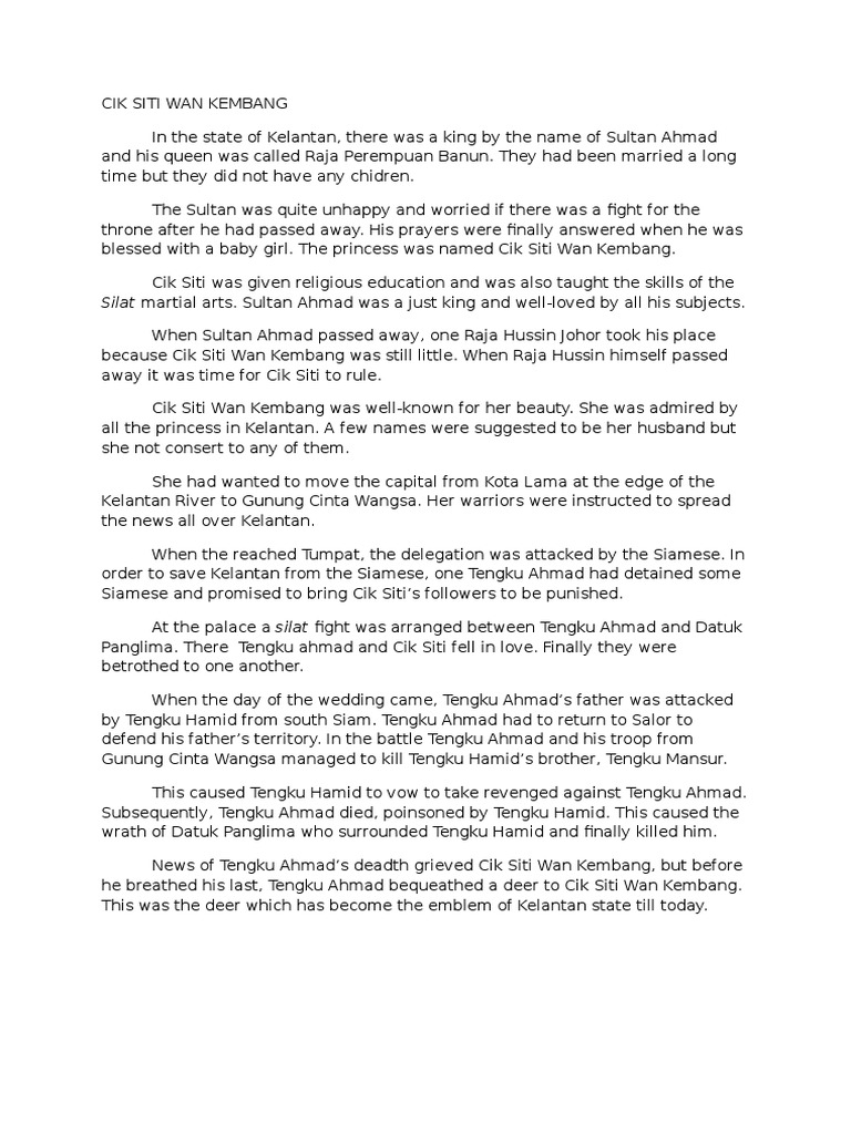 Lagu untuk cik siti wan kembang mmg kembang dan akhirnya ngaku jugak ini siti sebenar yg bob cari. Cik siti wan kembang kelantan. Sememangnya, cik siti wan kembang menjadi kebanggaan rakyat kelantan keseluruhannya. Compra vinili, cd e altro di siti wan kembang nel marketplace di discogs. Ilu leto puteri santubong puteri santubong liling live bysf17. It is said that, in 1345, the famous muslim traveller ibnu batutah visited siti wan. See more ideas about kembang, kelantan, malaysian clothes. Che siti never married, and therefore never had children of her own. Esplora tutte le pubblicazioni di siti wan kembang su discogs. Siapa cik siti wan kembang. We've heard of greek, norse and japanese mythology, so now let's introduce our legends to the world! Che siti wan kembang shortfilm. Che siti wan kembang , malezya yarımadası'nın doğu kıyısında , şu anda malezya'nın kelantan eyaletinde bulunan bir bölgede hüküm süren efsanevi bir kraliçeydi.