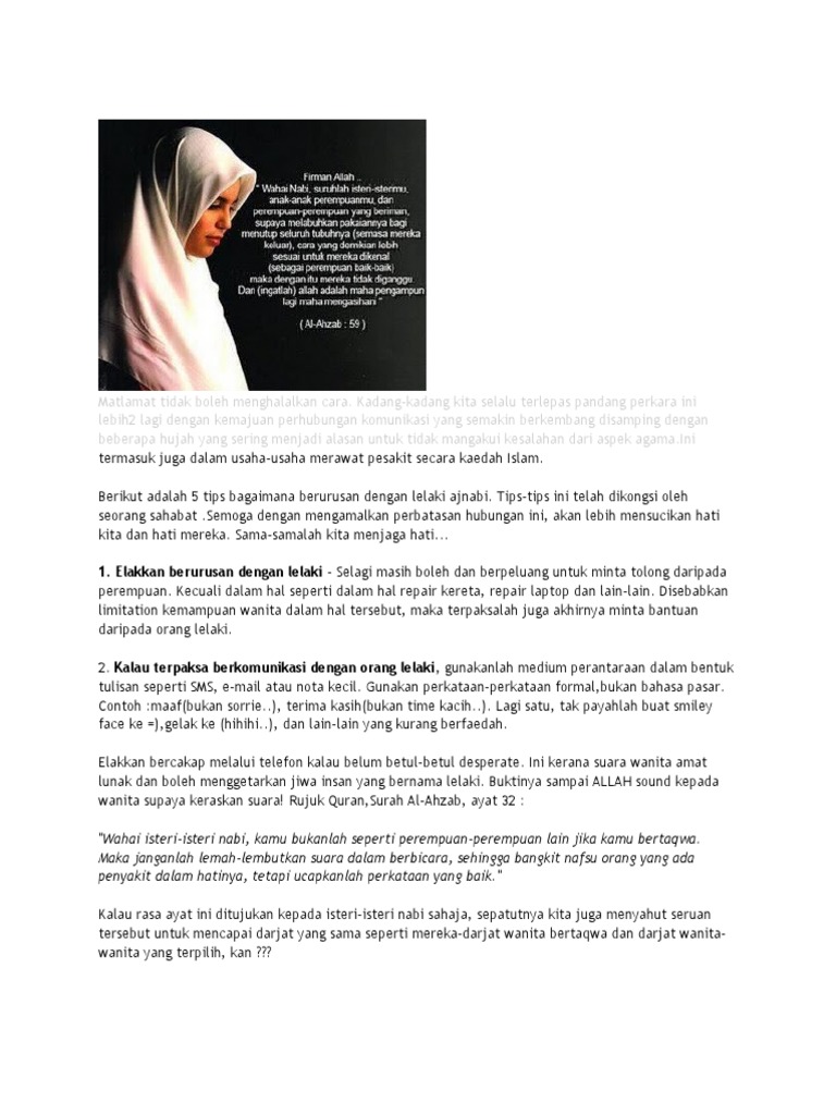 Cara menghilangkan ketombe secara alami. Cara mengobati mata bengkak setelah menangis. Bahkan ada di antaranya jauh tersasar daripada matlamat yang telah ditetapkan sebelum itu. Ertinya untuk mencapai suatu matlamat, cara perlaksanaannya mestilah bersih menurut tata cara islam. Ingatlah bahawa matlamat tidak menghalalkan cara.