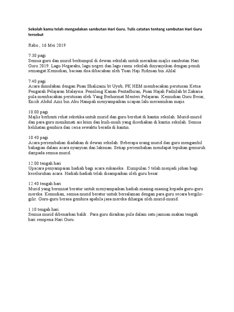 Teks perutusan hari guru tahun 2017 ketua pengarah pelajaran malaysia. Teks ucapan guru besar sempena hari graduasi prasekolah rumah 43. Pemilihan tema hari guru tahun. Teks eksemplum ini juga ikut termasuk dalam karya sastra yang berisi mengenai pengalaman hidup seseorang. Sambutan menteri pendidikan hari guru 2019 seputaran guru. Teks perutusan hari guru tahun 2017 ketua pengarah pelajaran malaysia. Kpm jom cipta tema hari guru 2018. Teks ucapan hari guru 2019. Teks ucapan yab tan sri dato' haji muhyiddin bin haji mohd yassin perdana menteri malaysia hari guru 2020berguru demi ilmu, bina generasi baharu. Yab tan sri dato' hj muhyiddin bin hj mohd yassin timbalan perdana menteri merangkap menteri pendidikan malaysia. View teks hari guru 2018 (autosaved).docx from ba 1222 at ipg kampus bahasa melayu. For more information and source, see on this link : Sambutan menteri pendidikan hari guru 2019 seputaran guru.