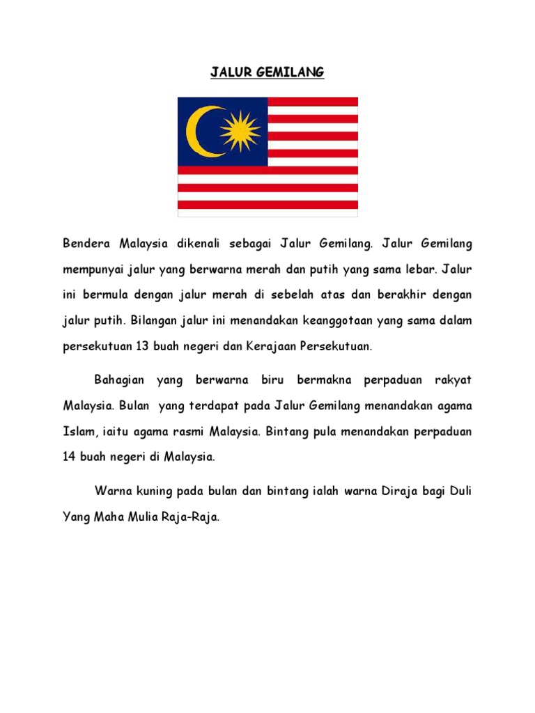 Keterangan jalur gemilang dalam bahasa melayu bahagian yang berwarna biru tua di atas sebelah kiri membawa ke bawah hingga atas jalur merah yang kelima itu maknanya perpaduan rakyat malaysia. Warna biru dalam kotak yang meneliligi bulan sabit dan bintang 14 itu menunjukkan perpaduan rakyat malaysia yang bebilang kaum agama dan bangsa. Nama bendera negara malaysia diajukan oleh tun mahathir bin mohammad pada malam 31 agustus 1997. Megah kami terasa jalur gemilang. Warna biru tua bermaksud perpaduan yang merupakan elemen paling penting bagi masyarakat berbilang kaum di malaysia. Kami semua bersatu perpaduan ketaatan amalan murni rakyat malaysia jalur gemilang. Sukuan berwarna biru tua melambangkan perpaduan dan rukun damai rakyat yang berbilang kaum. Siapa sahaja boleh mengecam bahawa bendera malaysia, jalur gemilang mempunyai 14 bucu. Warna biru melambangkan perpaduan hidup yang rukun dan damai manakala. Jalur gemilang yang gagah perkasa. = tanda agama islam sebagai agama rasmi malaysia. Lambang anak bulan membawa maksud islam sebagai agama rasmi negara sementara bintang pecah 14 menunjukkan perpaduan 13 buah negeri. Asal usul nama jalur gemilang.